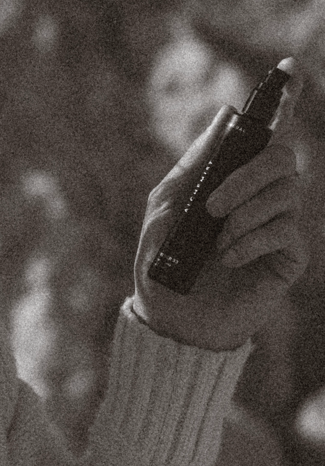 ALCHEMIST: Bulgarian Rose Water. Proprietary blend of plant and botanical infusions. Infusions of Gold. Contains coconut glycerin.